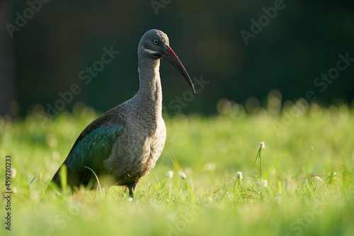 Naklejka premium Hadada Ibis - Bostrychia hagedash also hadeda, water bird native to Sub-Saharan Africa, large grey brown species of ibis, narrow long beak, wading african dark bird
