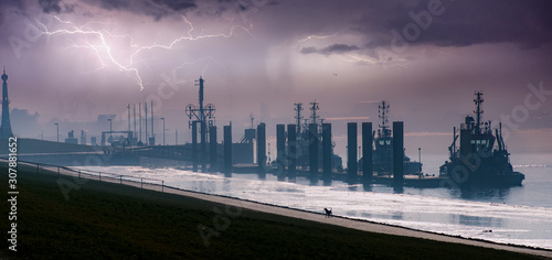 © Comofoto, Fototapeta premium Hafen Bremerhaven im Gewitter mit Hund