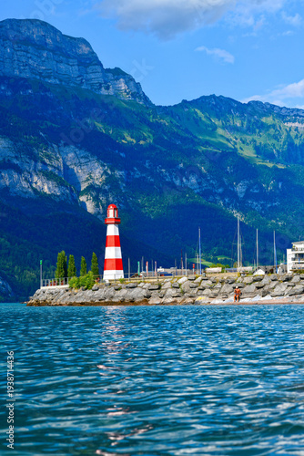 © Ilhan Balta, Fototapeta premium Hafen Unterterzen Gemeinde Quarten am Südufer des Walensees, Kanton St. Gallen