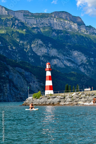 © Ilhan Balta, Fototapeta premium Hafen Unterterzen Gemeinde Quarten am Südufer des Walensees, Kanton St. Gallen