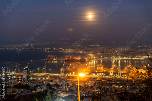 © elenarostunova, Obraz premium Haifa, Israel – March 7, 2025, View from Louis Promenade to the lower city and port at twilight under the full moon.