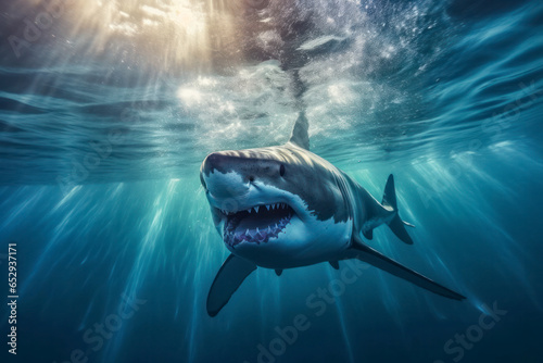 Fototapeta premium Haifisch, Weißer Hai schwimmt im Meer, Generative AI