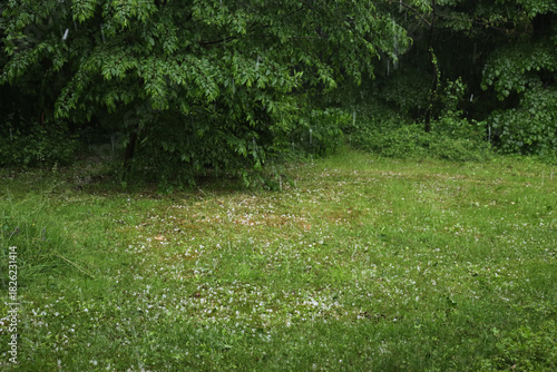 © saratm, Obraz premium Hailstorm in the garden on summer season. Meadow covered by hailstones