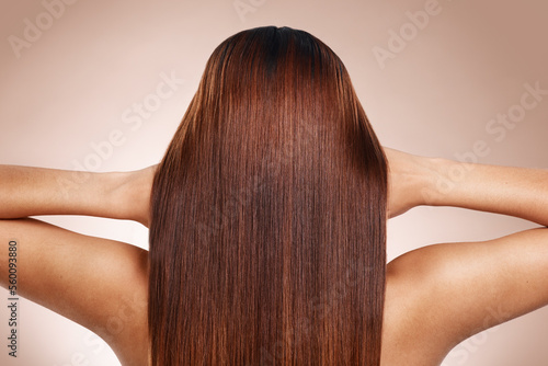 Naklejka premium Hair, beauty and back of woman in studio for hair care, hair products and...