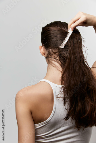 Naklejka premium Hair care, combing hair, beauty routine, personal grooming, healthy hair, hair texture, young woman, back view, hair styling, minimalistic background, natural hair color