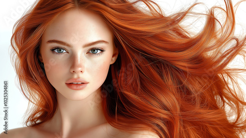 Obraz premium hair dye packaging image featuring a woman with well-groomed, wavy copper red hair. Her hair should appear smooth, glossy, and voluminous, with rich copper tones