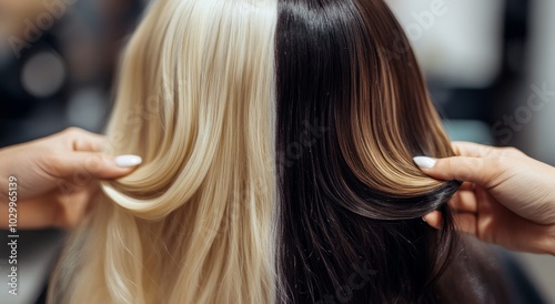 Obraz premium Hair Extensions Application by Professional Stylist, Blonde and Brown Hair Comparison Generative AI