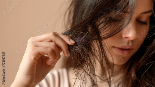 Obraz premium Hair health worries, A person looking at hair strands on their hand,...