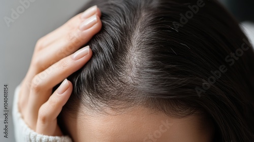© Pannin, Obraz premium Hair Loss Concept - Woman's Hands Touching Her Hair.