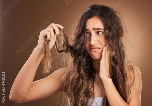 Obraz premium Hair loss, crisis and worried woman in studio for beauty, messy and damage against brown background. Haircare, fail and sad girl frustrated with weak, split ends or alopecia, dandruff and isolated