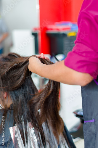 © Fotos 593, Naklejka premium Hair on dyeing process, a person preparing the rest of the hair to be cut