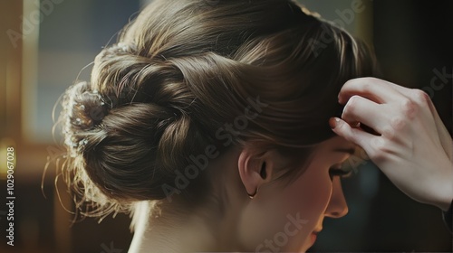Naklejka premium Hair stylist arranging hair into an elegant updo, highlighting the precision and artistry involved