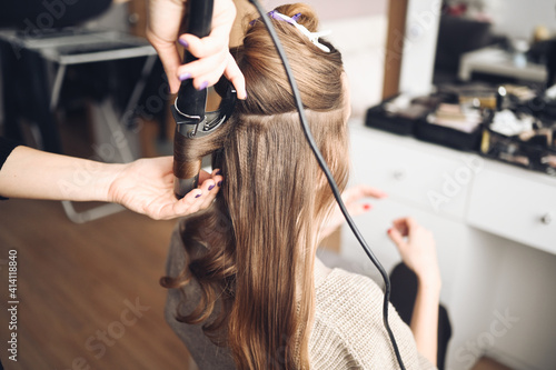 © Алина Троева, Fototapeta premium Hair stylist prepares beautiful young woman for event, makes curls hairstyle with a curling iron for client in beauty salon. Long beautiful light brown natural hair.