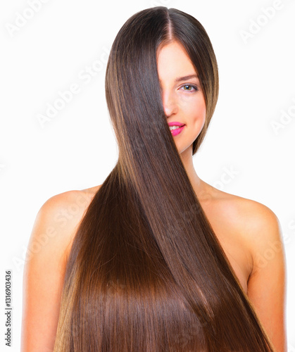 Obraz premium Haircare, smile and portrait of girl in studio for natural keratin treatment, shampoo or healthy glow. Cosmetics, results and face of woman with long hair, wellness and confidence on white background