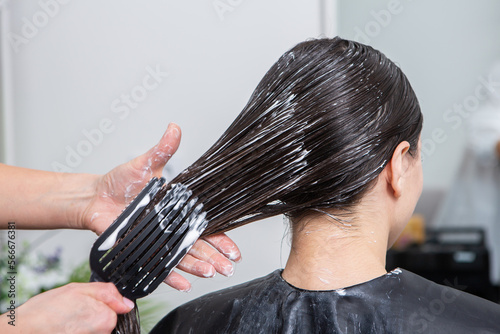 © Nomad Pixel, Naklejka premium Hairdresser applies a hair mask to straight black hair. Hair care at the beauty salon.