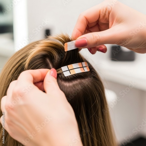 © Margarita Ratatosk, Naklejka premium Hairdresser attaching extension to woman's hair. Hair replacement system for volume and length. Treatment for hair loss concept.