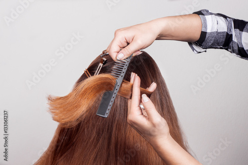 Fototapeta premium Hairdresser combing brown-haired person holding scissors in hand