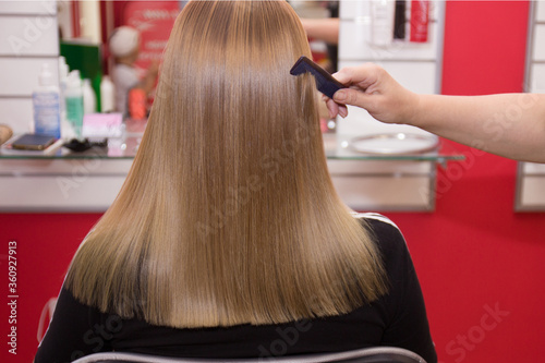 © Natalya, Fototapeta premium Hairdresser combs girl's hair after haircut and dyeing
