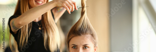© H_Ko, Fototapeta premium Hairdresser Cutting by Scissors Ponytail Portrait