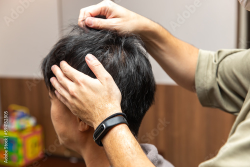 © 望菜 竹内, Naklejka premium hairdresser cutting hair 美容師が男性のヘアーセットをしている