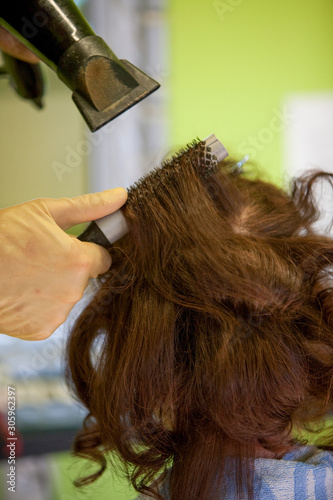 © Bjorn B, Naklejka premium Hairdresser doing a woman's hair in professional hairdressing salon or barbershop , seen from behind the customer, unrecognizable.