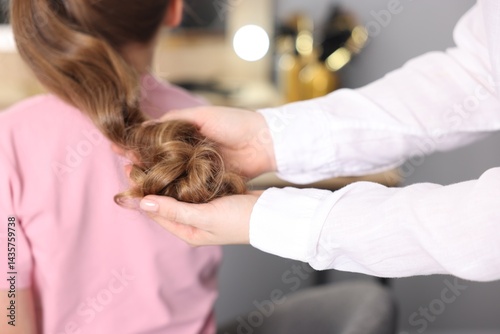 Fototapeta premium Hairdresser doing girl's hairstyle in salon, closeup