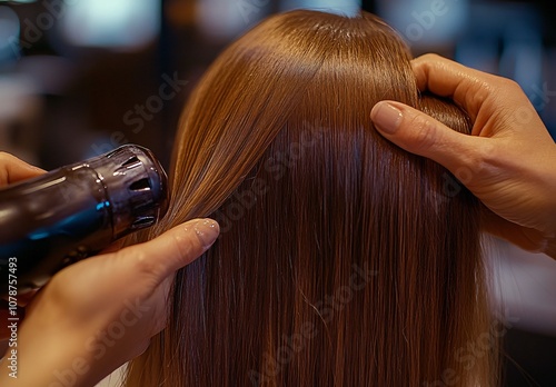 © Shehub, Naklejka premium Hairdresser Drying Long Brown Hair with Blow Dryer