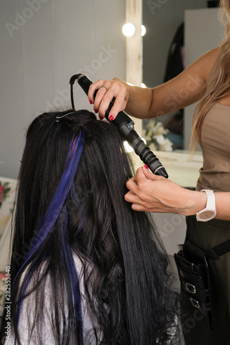 © Vagengeim, Fototapeta premium Hairdresser makes hairstyle to client. Hairdressing services. Creating hairstyle. Hair styling process. Beauty service concept
