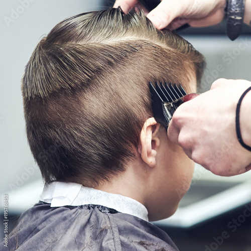 Fototapeta premium Hairdresser making a haircut to a boy with clipper.