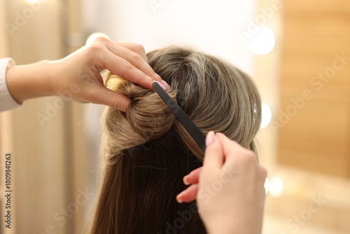 Naklejka premium Hairdresser putting clip into woman;s hair in salon, closeup
