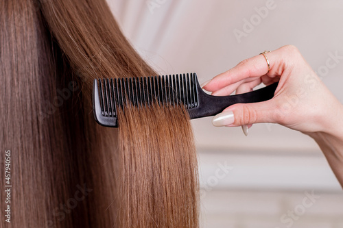 © Galina, Fototapeta premium Hairdresser's hand brushing long brunette hair in beauty salon