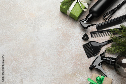 © New Africa, Obraz premium Hairdresser's tools and Christmas decor on color textured table, flat lay. Space for text