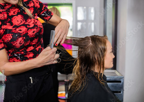 © Tyler Olson, Naklejka premium Hairdresser Styling Hair Of Customer In Beauty Salon