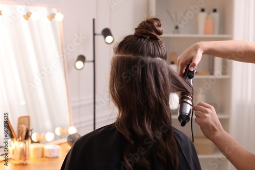 Fototapeta premium Hairdresser using curling hair iron while working with woman in salon, closeup