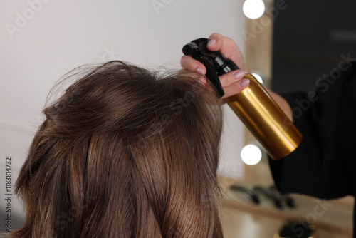 Fototapeta premium Hairdresser using spray while making stylish haircut in salon, closeup