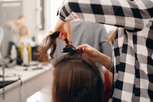 © Parilov, Naklejka premium Hairdresser woman straightens her hair and makes styling, close-up of curling iron in salon