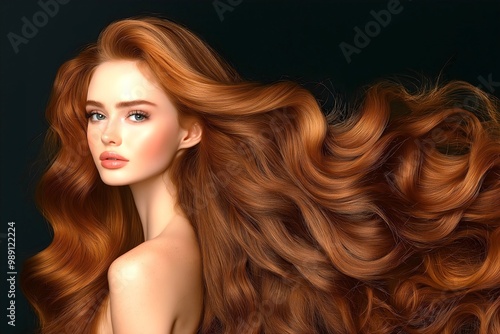 © Rebecca Jestico, Obraz premium Hairdressing advertising logo beauty salon poster banner long red brown curly hair. Shampoo serum conditioner products.
