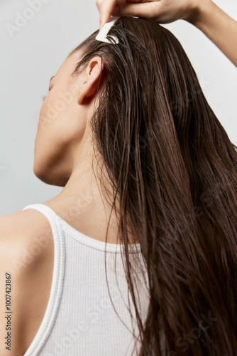 Naklejka premium hairstyle, hair care, beauty, grooming, young woman, long hair, combing, personal care, healthy hair, daily routine, minimalist background, fashion vibe