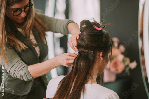 Fototapeta premium Hairstylist tying up clients hair.