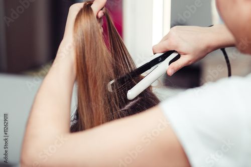 Fototapeta premium Hairstylist using a curling iron of a female client in a hairdressing salon,...