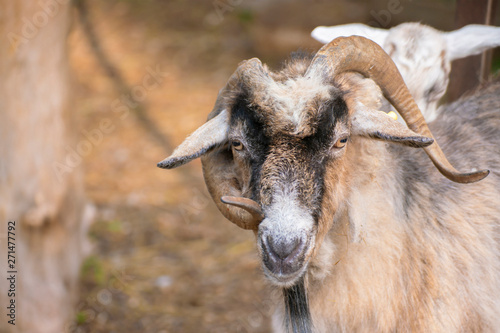 Naklejka premium hairy goat portrait with curly horns in the zoo, mammal animals