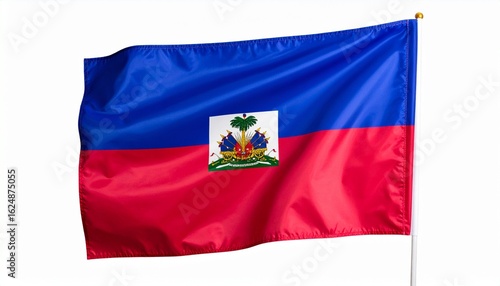 © DeepGrid , Fototapeta premium Haiti national flag with horizontal blue and red bands and central white panel featuring coat of arms with palm tree, cannons, and motto “L'Union Fait La Force,” symbolizing unity, resilience, and nat