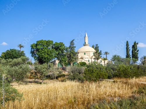 Fototapeta premium Hala Sultan Tekke seen from a distance. The mosque is surrounded by lush...