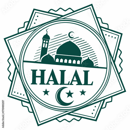 © Khadija, Naklejka premium Halal food label with mosque and crescent moon
