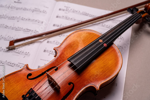 Fototapeta premium Halbe Geige mit Bogen liegt auf Notenblatt, Studioaufnahme, Deutschland