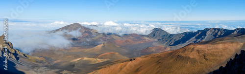 © Sean Xu, Fototapeta premium Haleakala Crater - A panoramic view of the crater at summit (10,023 feet) of Haleakala, also called East Maui Volcano, surrounded by sea of clouds. Maui, Hawaii, USA.