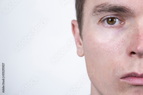 © Никита Шершов, Fototapeta premium Half a man's face with the expression of grief on his face and tearful eyes.
