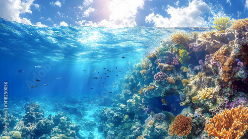 © abid, Naklejka premium Half and half image of ocean with coral reef and blue sky filled with fishes sun ray and clouds