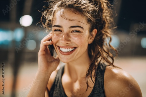 © TuruMuru, Fototapeta premium Half body image of a happy athletic woman smiling at the camera while on a call