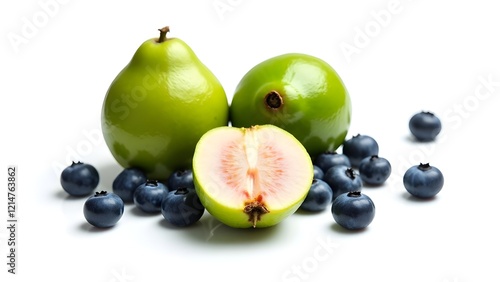 © Dalilah, Obraz premium half-cleaned blueberries and guava isolated on a pure white background